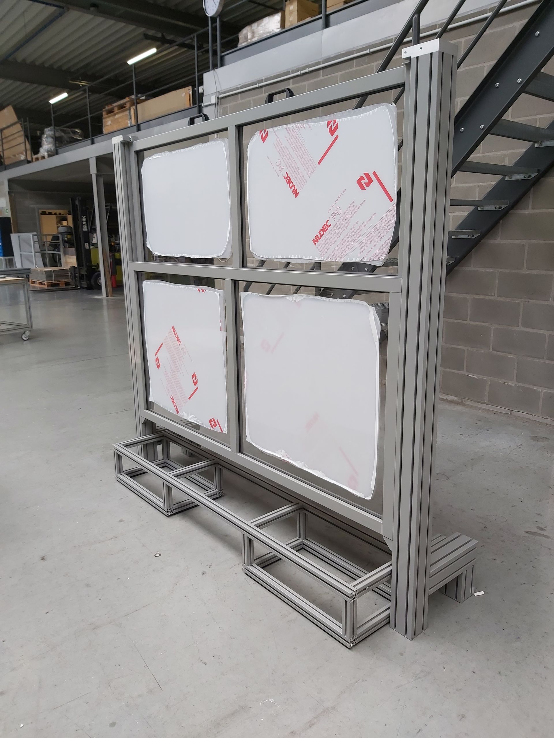 Graag presenteren wij u onze projecten van machinebouw en omkasting. U ziet hieronder een beweegbare afscherming van een machine, een afgesloten omkasting in een atelier en een montagetafel. Al deze zaken werden gemaakt met behulp van aluminiumprofielen en toebehoren van Alumes.